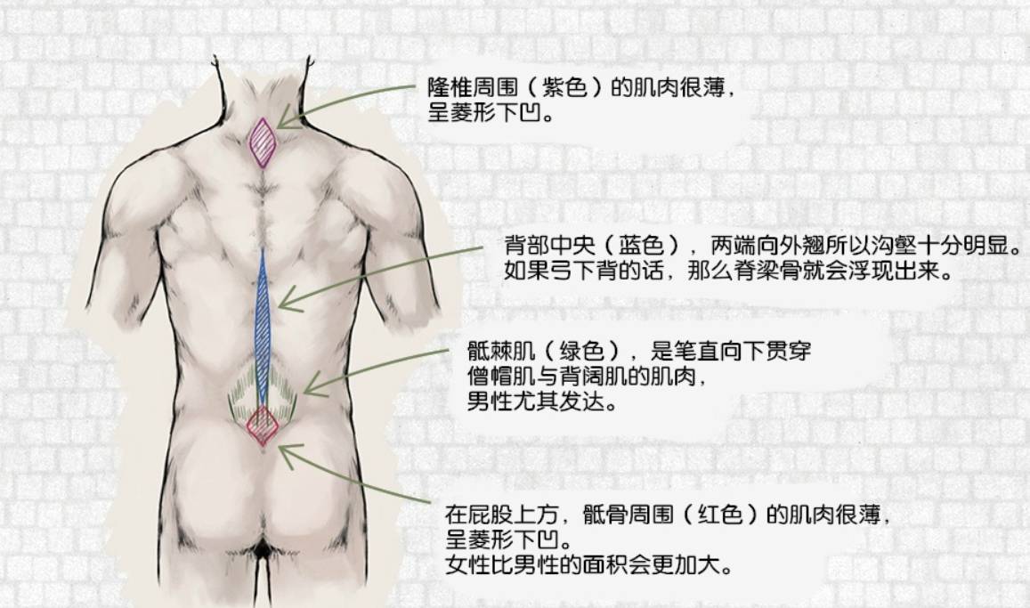 隆椎周围(紫色)的肌肉很薄,呈菱形下凹。背部中央(蓝色),两端向外翘所以沟壑十分明显。如果弓下背的话,那么脊梁骨就会浮现出来。骶棘肌(绿色),是笔直向下贯穿。僧帽肌与背阔肌的肌肉,男性尤其发达。