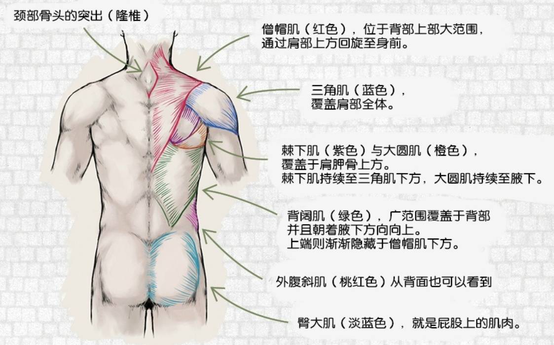 颈部骨头的突出(隆椎)。僧帽肌(红色),位于背部上部大范围,通过肩部上方回旋至身前。三角肌(蓝色),覆盖肩部全体。棘下肌(紫色)与大圆肌(橙色),覆盖于肩胛骨上方。棘下肌持续至三角肌下方,大圆肌持续至腋下。背阔肌(绿色),广范围覆盖于背部并且朝着腋下方向向上。上端则渐渐隐藏于僧帽肌下方。