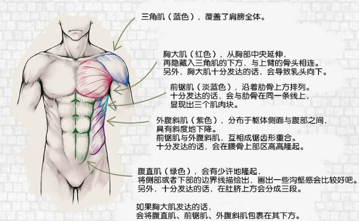 如果胸大肌发达的话,会将腹直肌、前锯肌、外腹斜肌包裹在其下方。