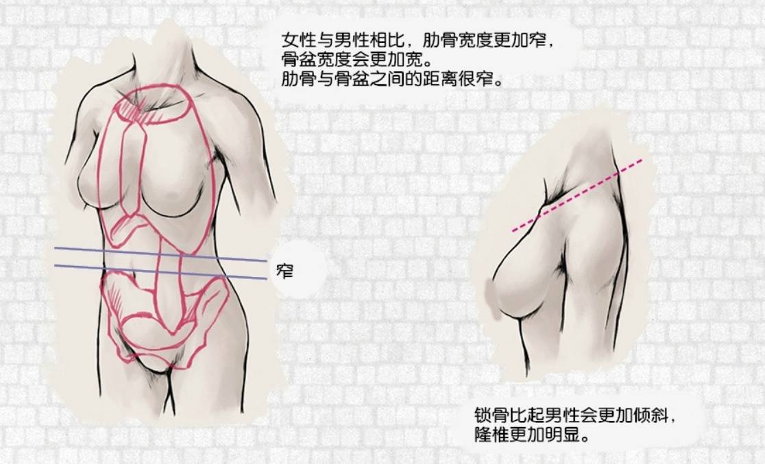 女性与男性相比,肋骨宽度更加窄,骨盆宽度会更加宽。肋骨与骨盆之间的距离很窄。锁骨比起男性会更加倾斜,隆椎更加明显。