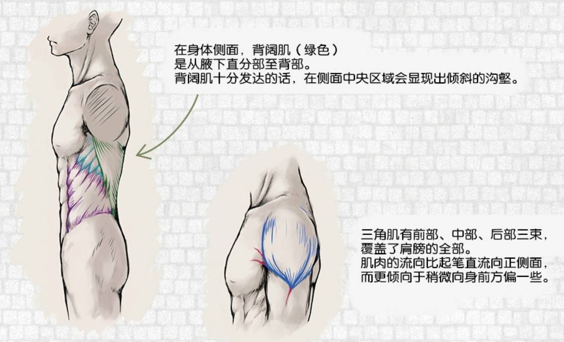 在身体侧面,背阔肌(绿色),是从腋下直分部至背部。背阔肌十分发达的话,在侧面中央区域会显现出倾斜的沟壑。