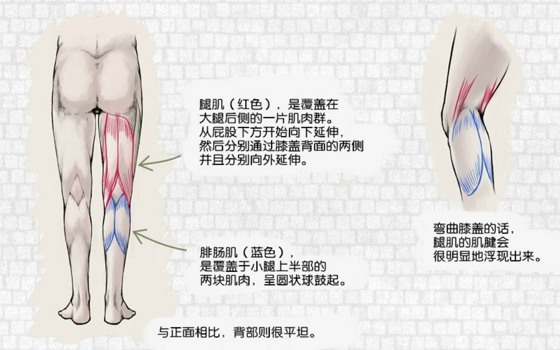 弯曲膝盖的话,腿肌的肌腱会很明显地浮现出来。腓肠肌(蓝色),是覆盖于小腿上半部的两块肌肉,呈圆状球鼓起。