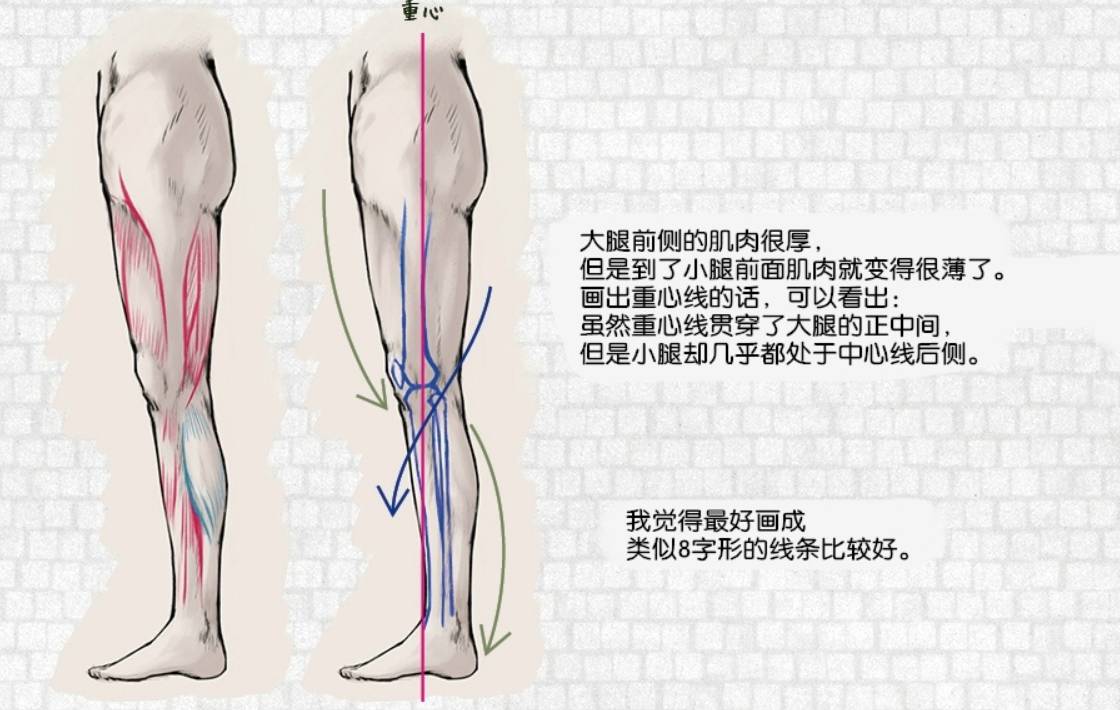 大腿前侧的肌肉很厚,但是到了小腿前面肌肉就变得很薄了。画出重心线的话,可以看出:虽然重心线贯穿了大腿的正中间,但是小腿却几乎都处于中心线后侧。我觉得最好画成类似8字形的线条比较好。