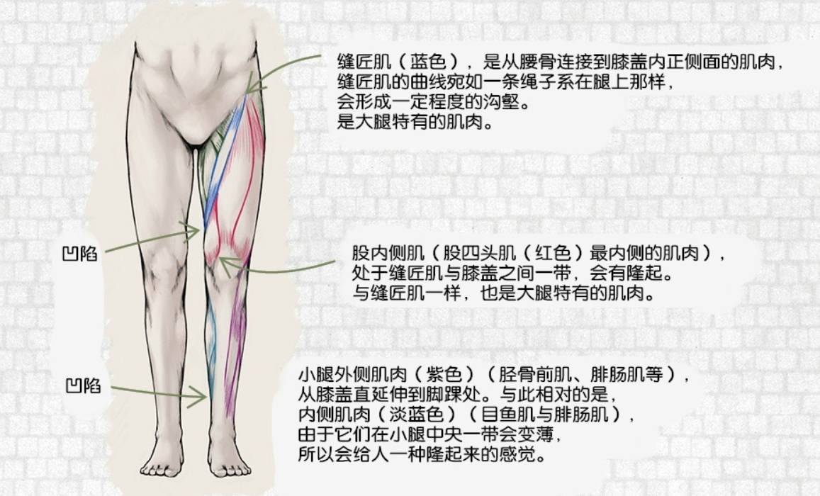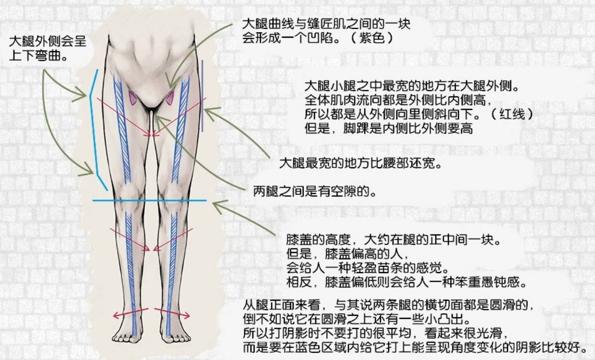大腿曲线与缝匠肌之间的一块会形成一个凹陷。(紫色)大腿小腿之中最宽的地方在大腿外侧。全体肌肉流向都是外侧比内侧高,所以都是从外侧向里侧斜向下。(红线)但是,脚踝是内侧比外侧要高。