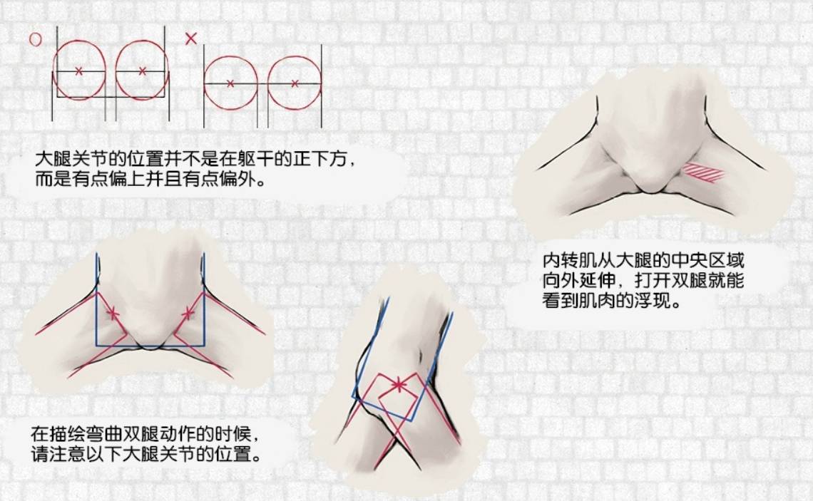 在描绘弯曲双腿动作的时候,请注意以下大腿关节的位置。