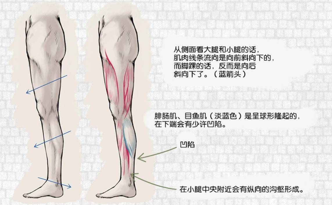从侧面看大腿和小腿的话,肌肉线条流向是向前斜向下的,而脚踝的话,反而是向后斜向下了。(蓝箭头)