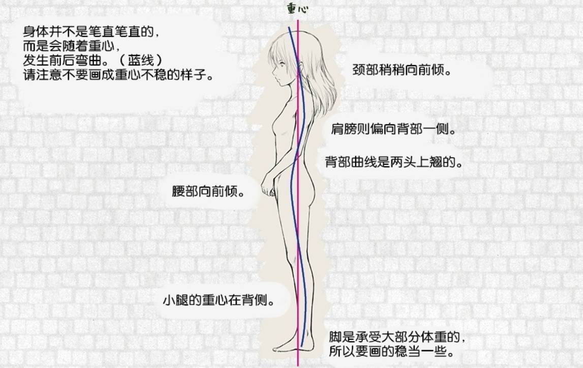 身体并不是笔直笔直的,而是会随着重心,发生前后弯曲。(蓝线)请注意不要画成重心不稳的样子。