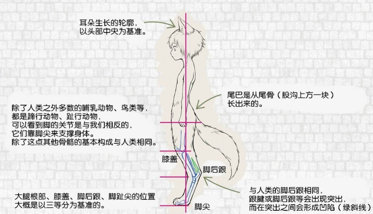 与人类的脚后跟相同,跟腱或脚后跟等会出现突出,而在突出之间会形成凹陷(绿斜线)大腿根部、膝盖、脚后跟、脚趾尖的位置,大概是以三等分为基准的。