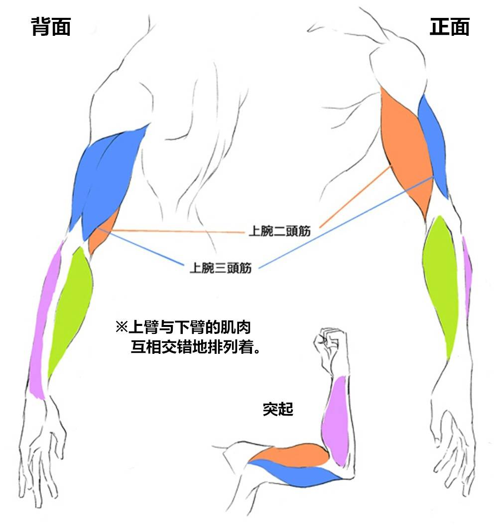大家可以看到背面和正面的肌肉,有上腕二頭筋和上腕三頭筋。上臂与下臂的肌肉互相交错地排列着。把手向上收起来时,手臂的肌肉会突起。