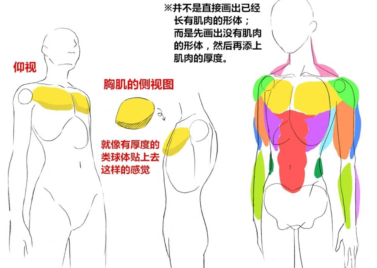 并不是直接画出已经长有肌肉的形体。而是先画出没有肌肉的形体,然后再添上肌肉的厚度。胸肌的侧视图可以看到就像有厚度的类球体贴上去这样的感觉。