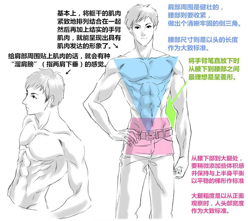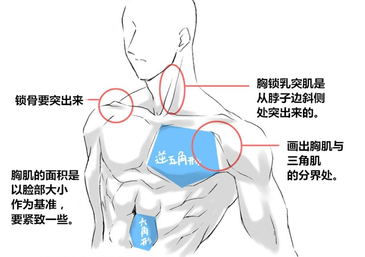 如果你做了以上两点.…那你基本上画成了猩猩,而不是壮男了,请注意!胸肌是倒五边形,腹肌要一个一个画成圆形。还有就是要将腹肌分割成类似六边形的感觉,我推荐这样的画法。