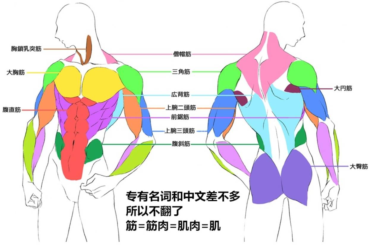关于人体的肌肉部位,有胸鎖乳突筋、僧帽筋、大胸筋、三角筋、大円筋、広背筋、腹直筋、上腕二頭筋、前鋸筋、上腕三頭筋、腹斜筋、大臀筋这些,更加具体的,大家可以观看下面的图。