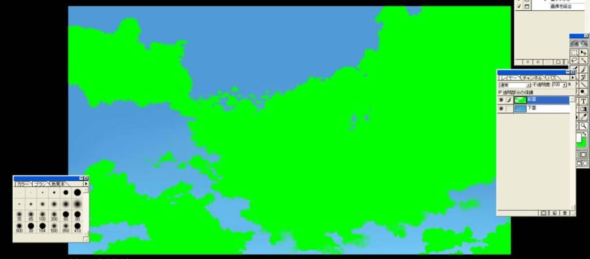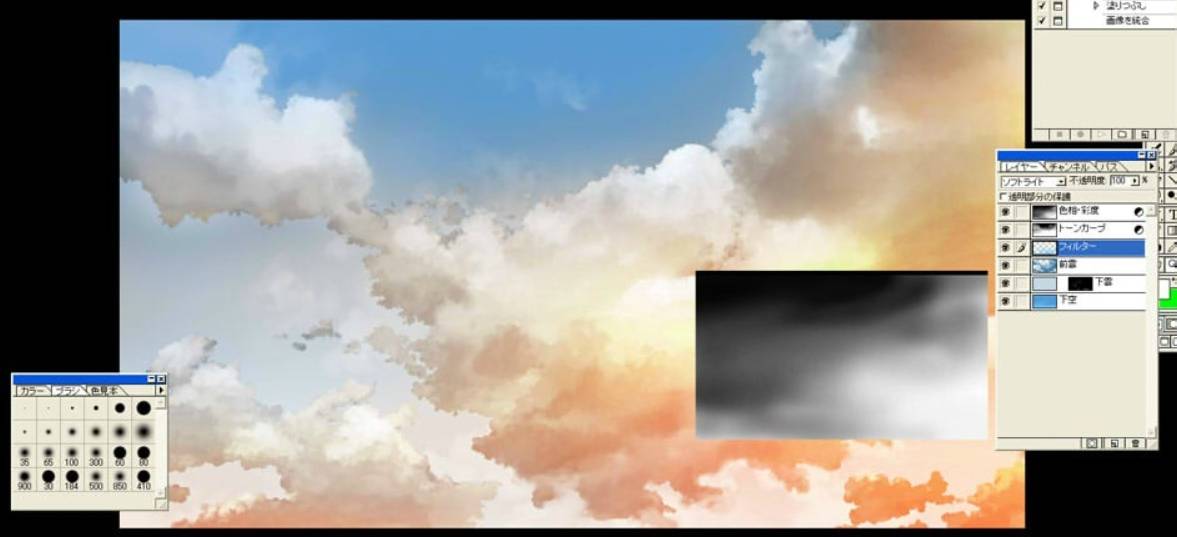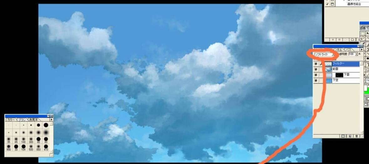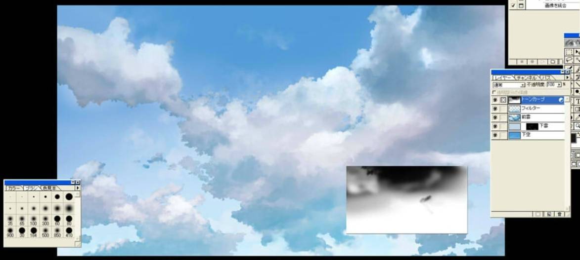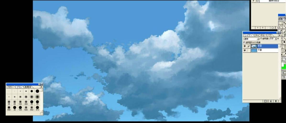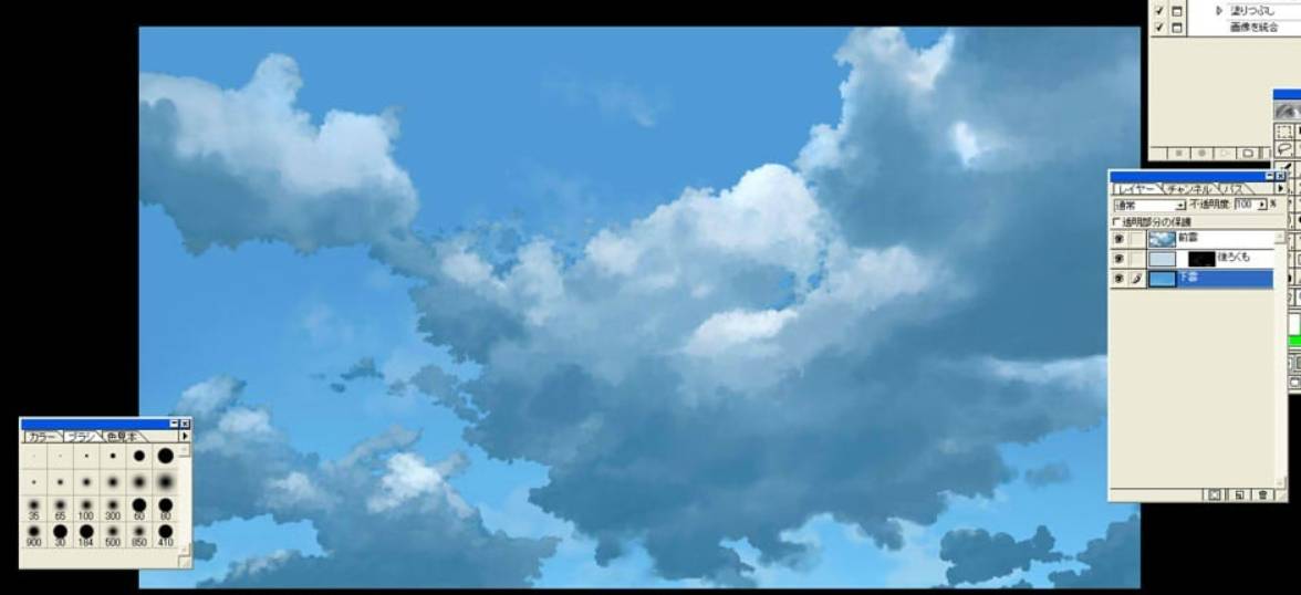 接下来描绘云彩。首先用容易分辨的颜色描绘出云彩的形状。这就是主要的云朵的底子了。
