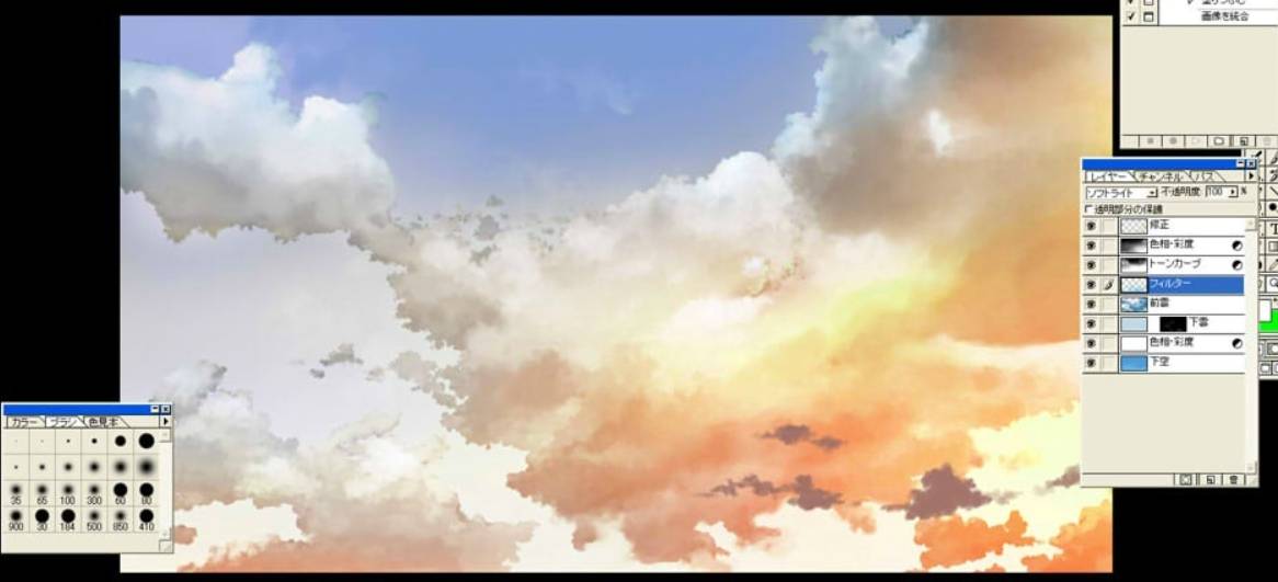 在最后,利用色彩曲线工具或者色相/饱和度工具等添上一些云彩的斑纹,再进行一下修正就结束了。(花了8小时左右,泪目)