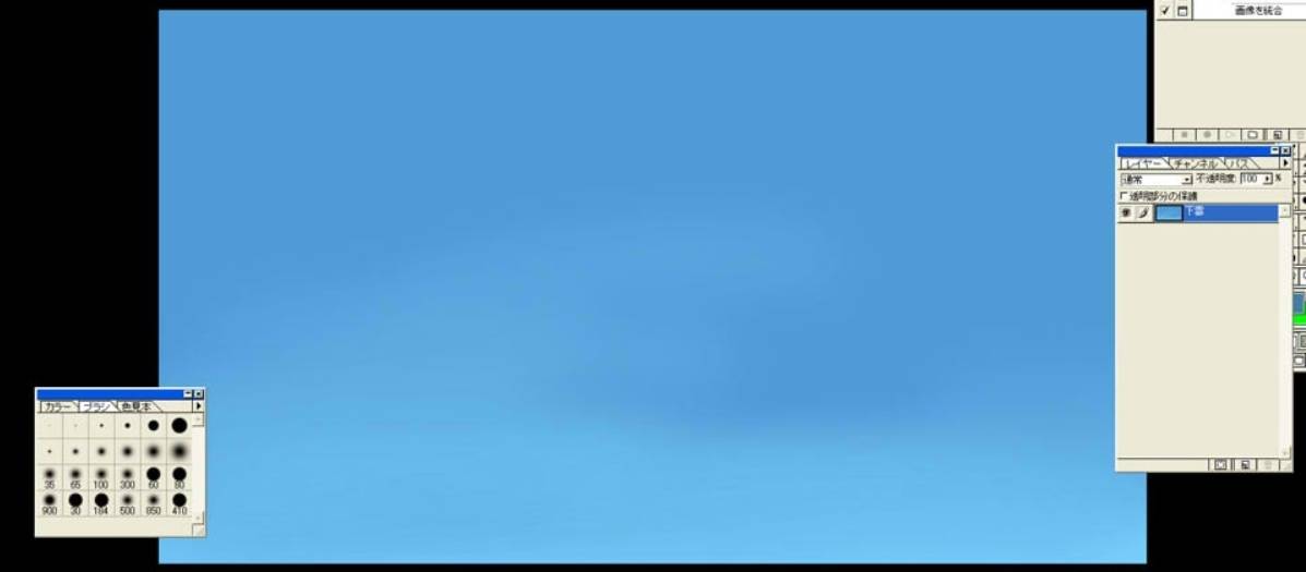 这次我们使用ps来绘画好看的天空。我不用自定义笔刷之类的。或者说压根就没有自定义笔刷。PS呢,基本都是非常普通的设定。那么,首先先画出天空的底色,少许打上一些渐变效果。