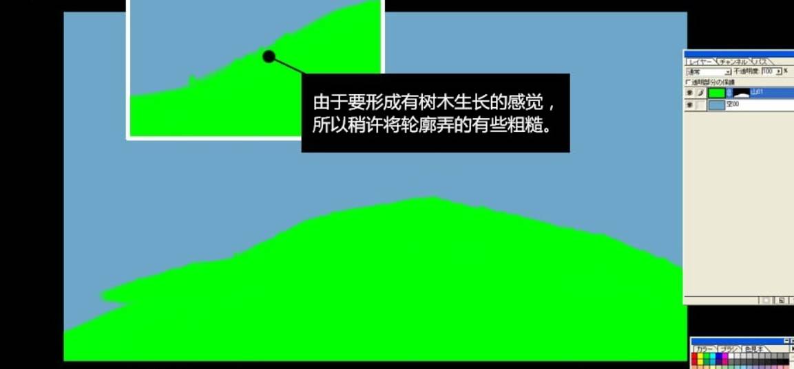 接下来画一下山的轮廓。由于要形成有树木生长的感觉,所以稍许将轮廓弄的有些粗糙。