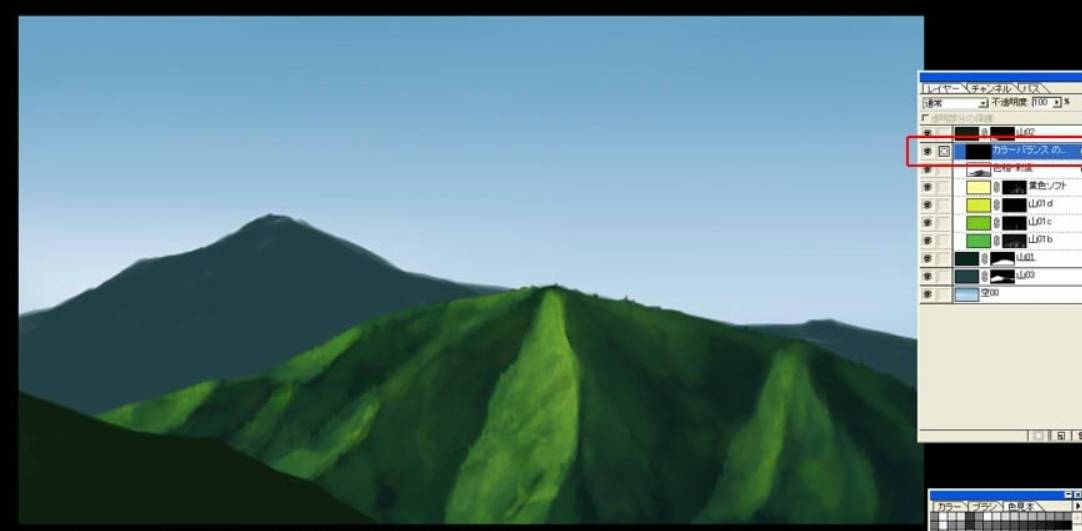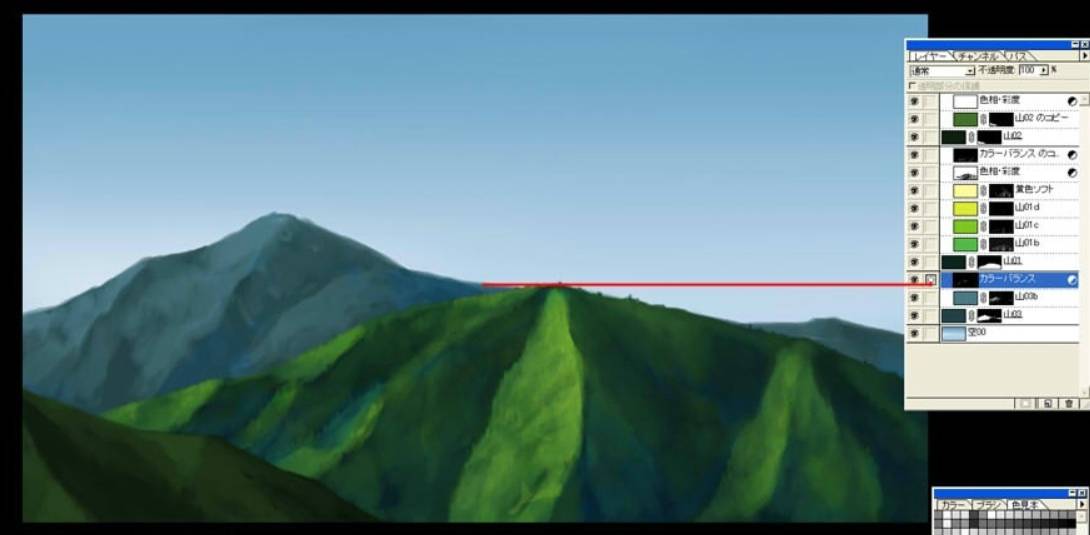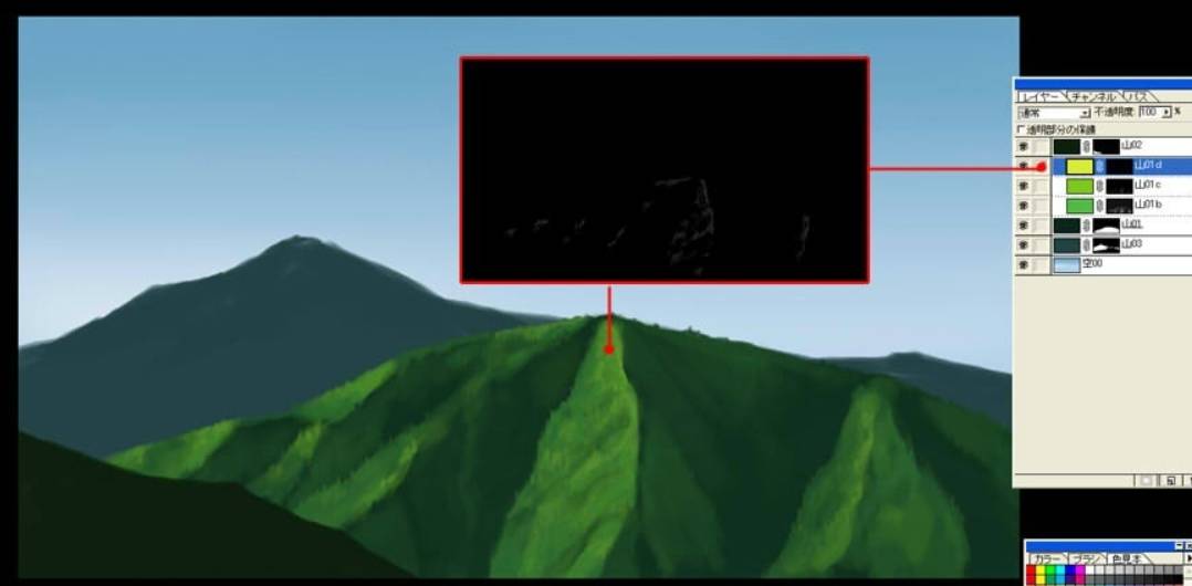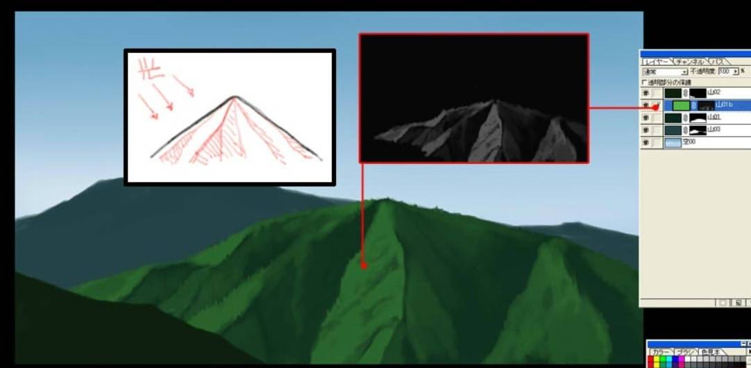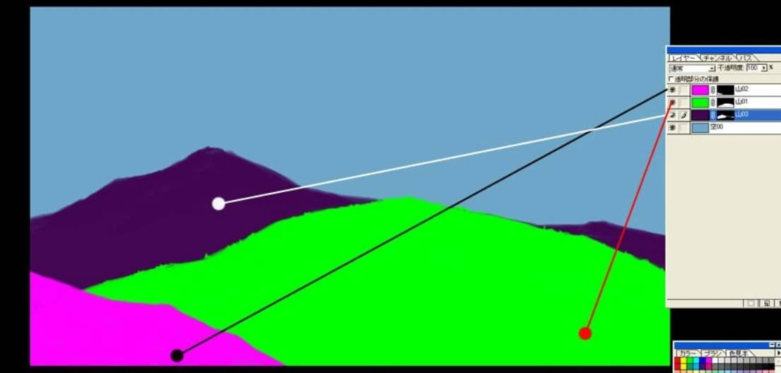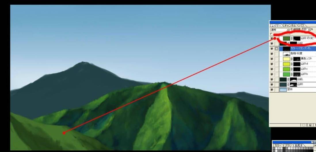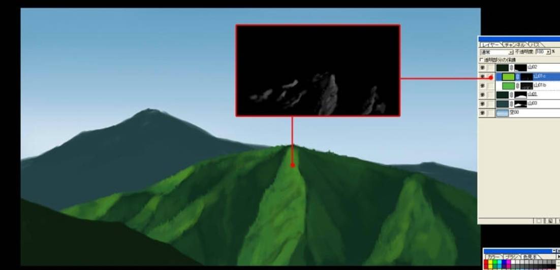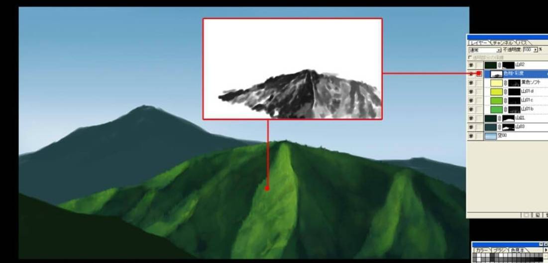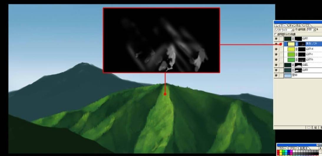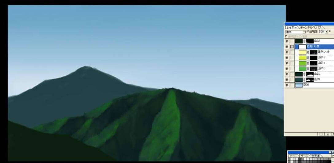 在黄绿色山的图层上下各新建新图层,在黄绿色山的前面与后面描绘新的山。
