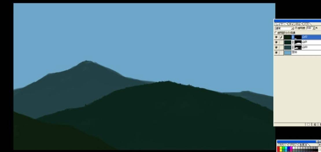 接下来是面前的山,和刚刚涂色完毕的中间的山的感觉是一样的,进行涂色。