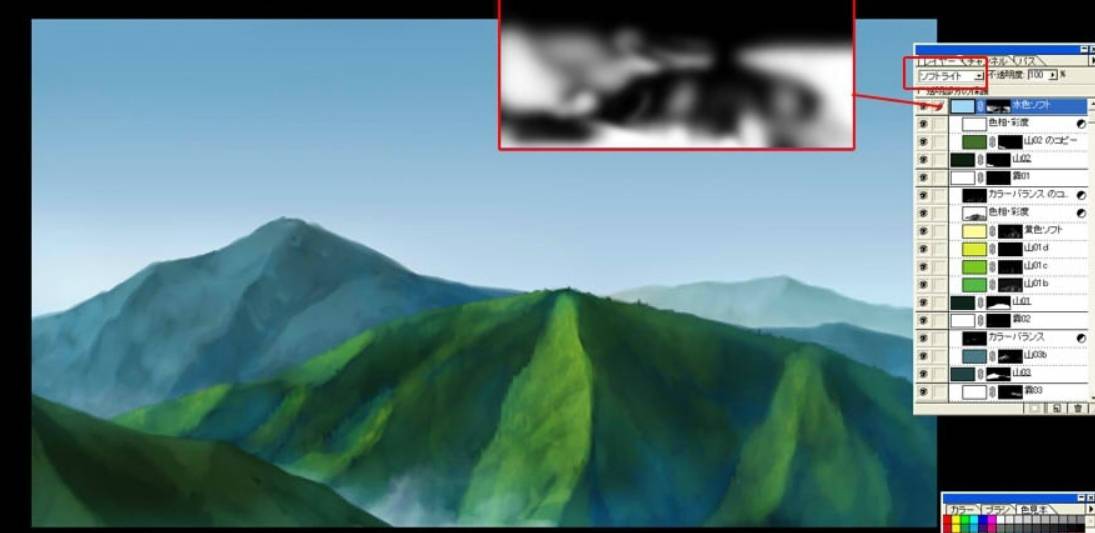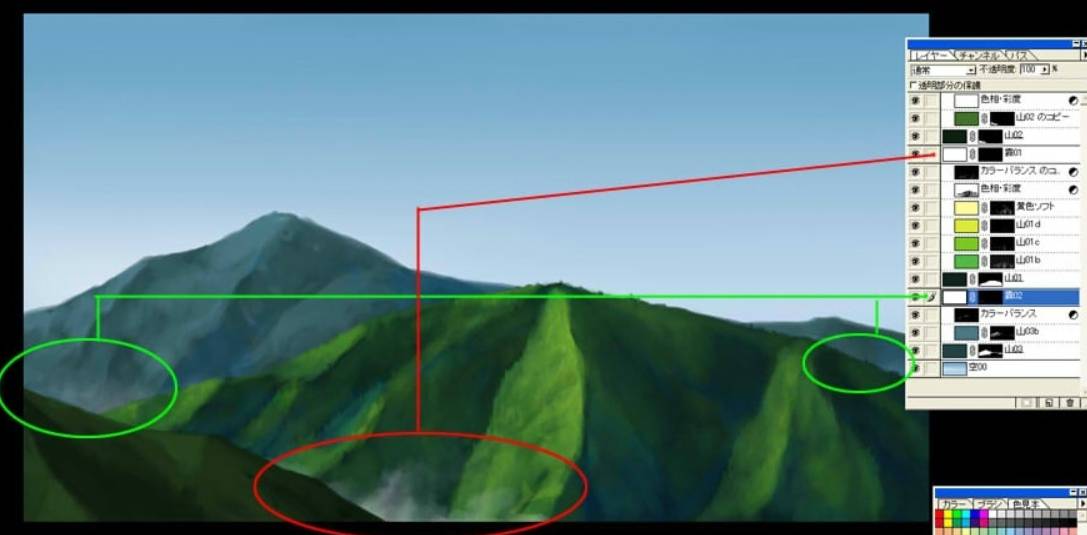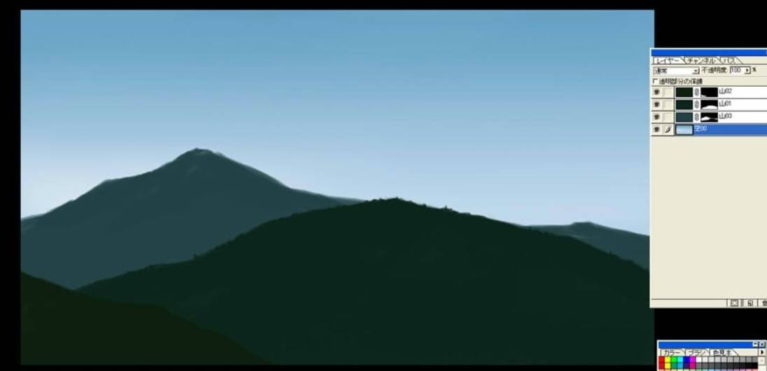 由于是山,所以将颜色弄成绿色系。将最前面的山的颜色弄暗,越是远处的山,颜色的饱和度越是要降低,颜色越是淡。