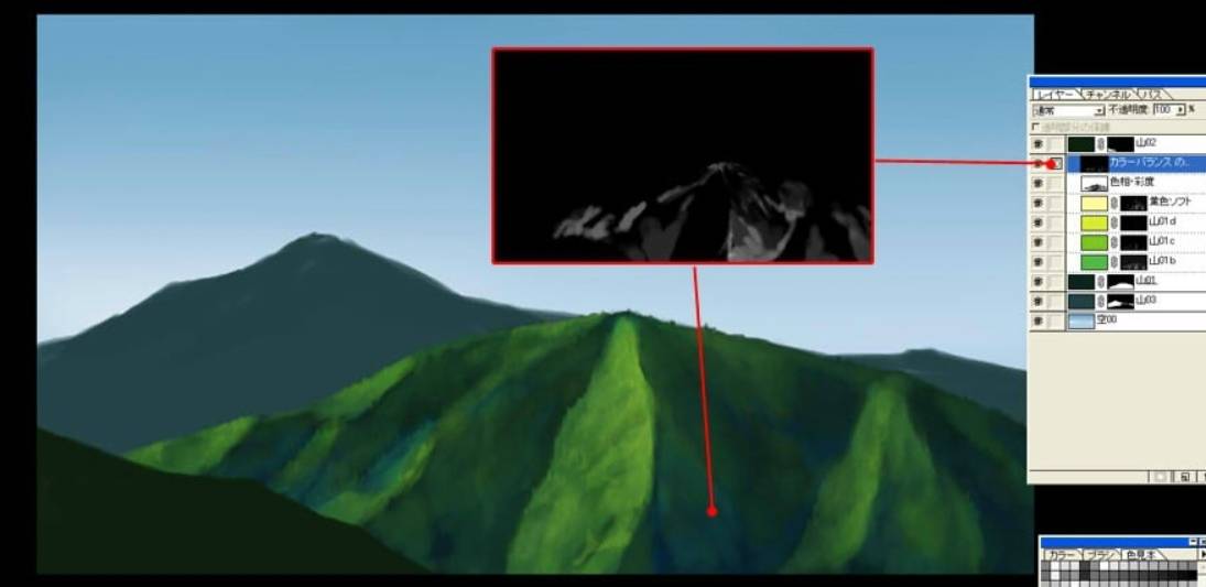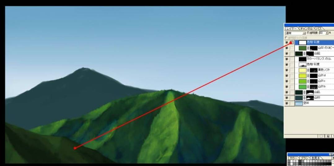 一边意识着山体明亮的部分,一边在色相/饱和度调整图层上进行涂色。