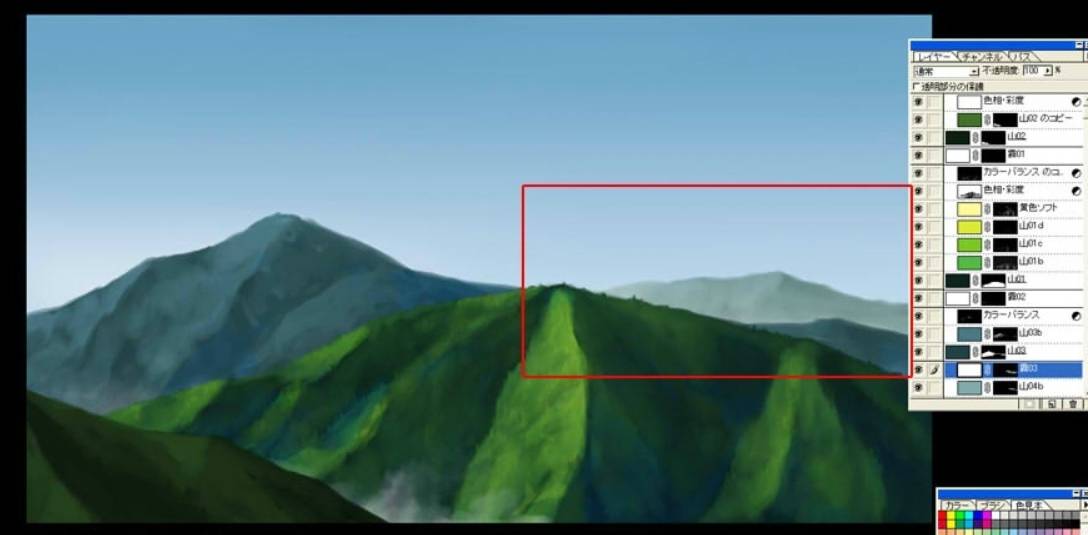 虽然色相饱和度图层已经弄暗了,但是因为要强调正中间的山。所以颜色就这样暗着,进行操作。