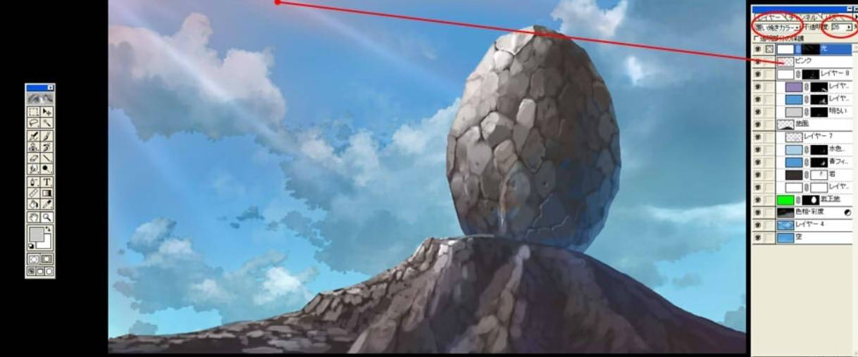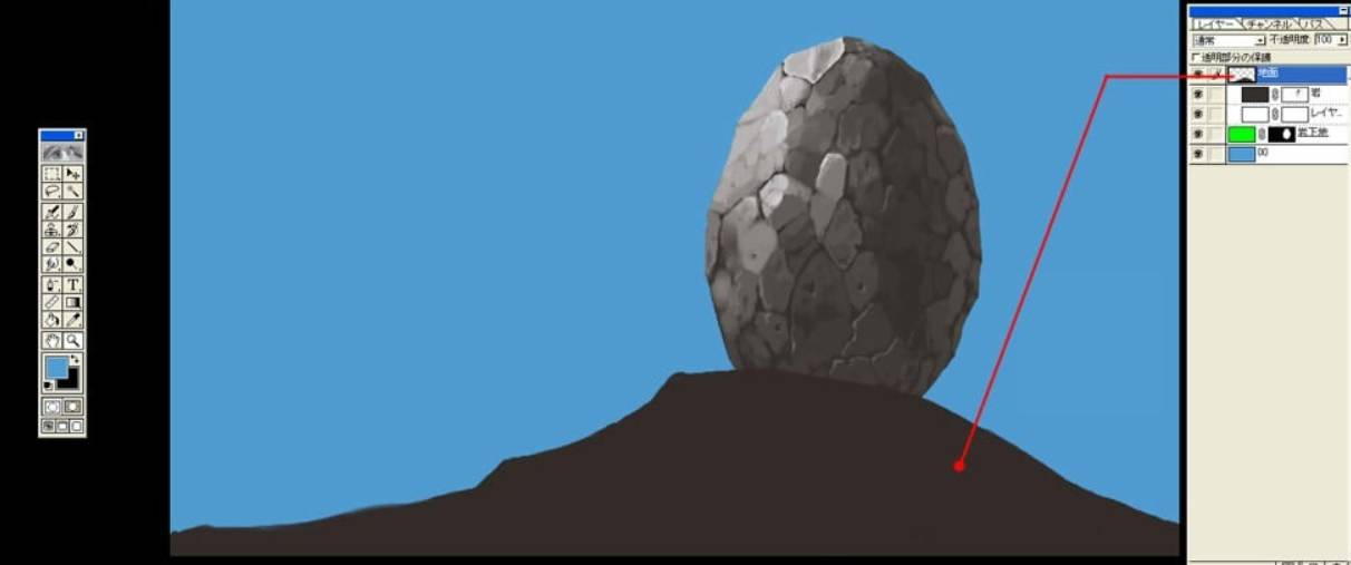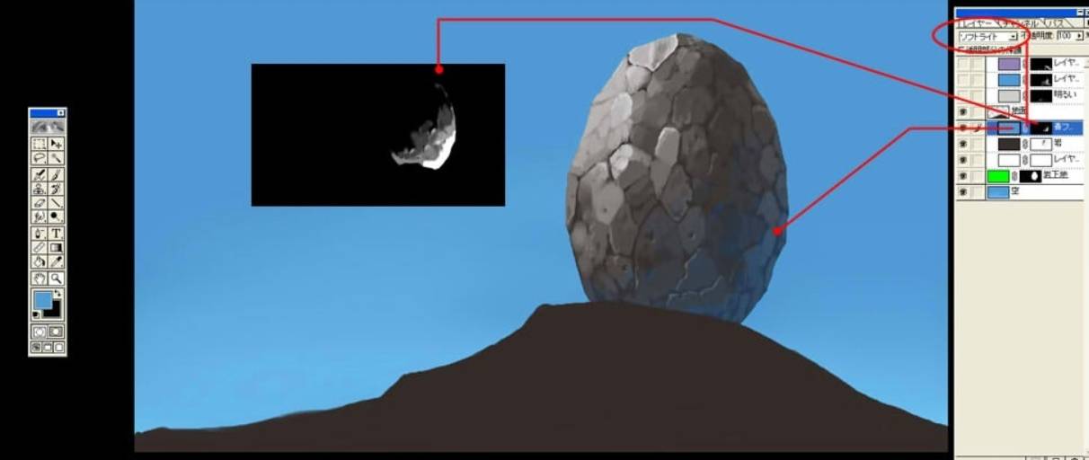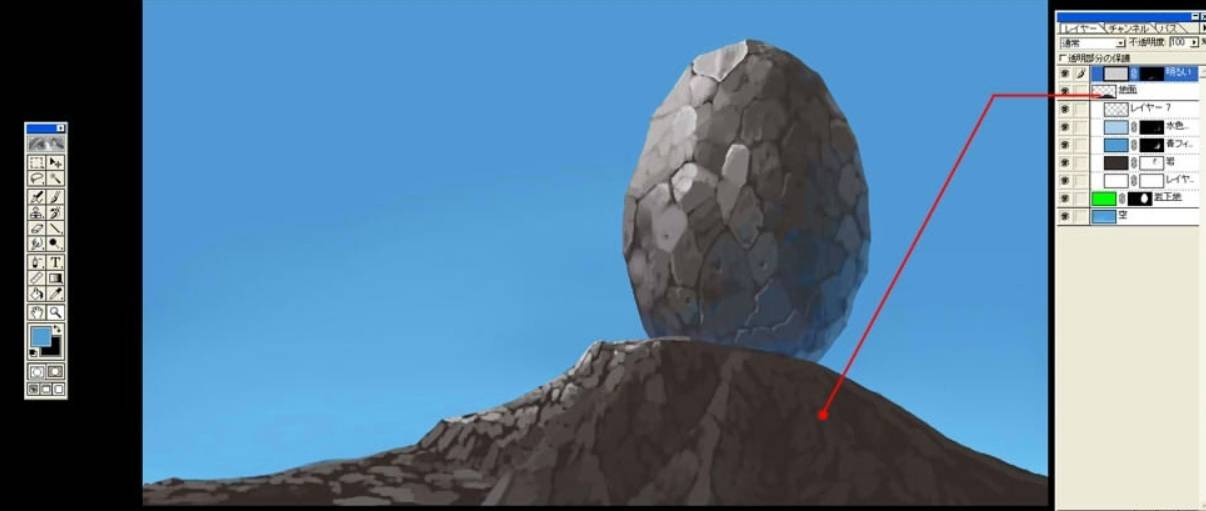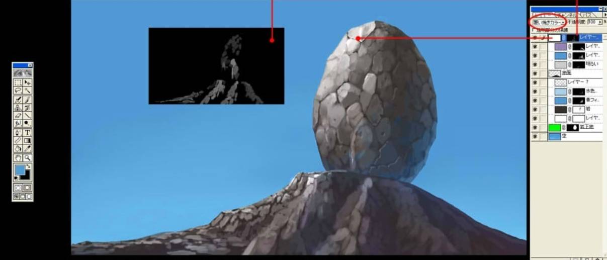 最后在画着岩石底色的图层的下方新建一个图层,图层模式设定为“颜色减淡”后打上近似于白色的颜色。