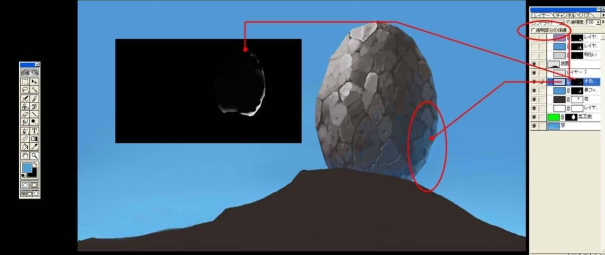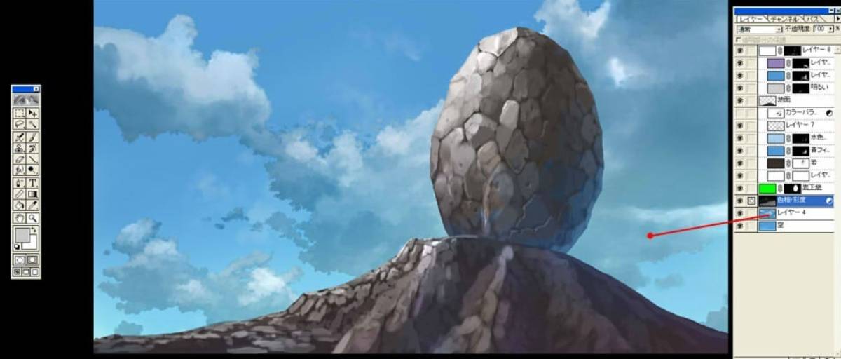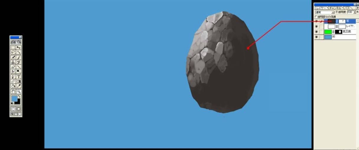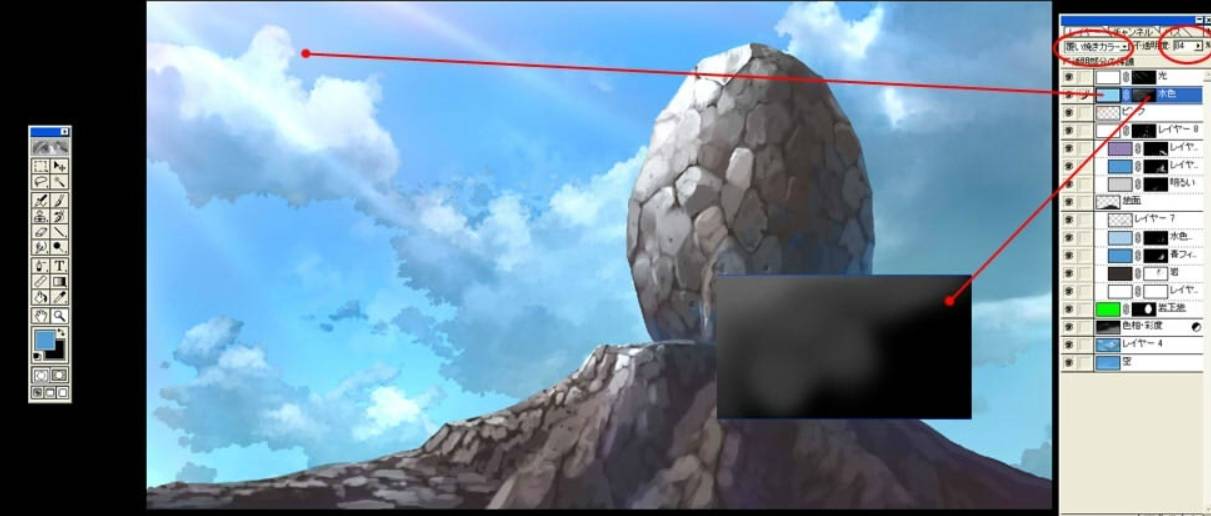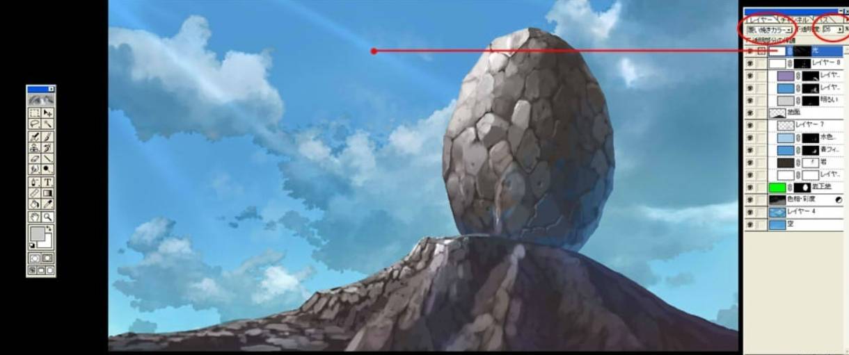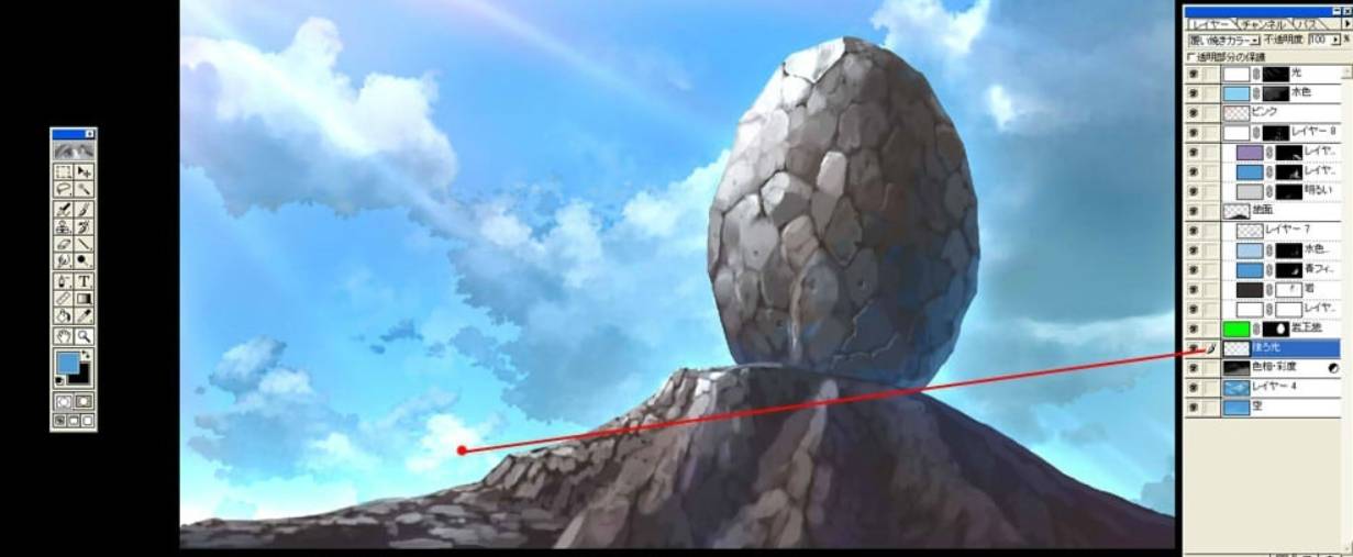 最后在画着岩石底色的图层的下方新建一个图层,图层模式设定为“颜色减淡”后打上近似于白色的颜色。