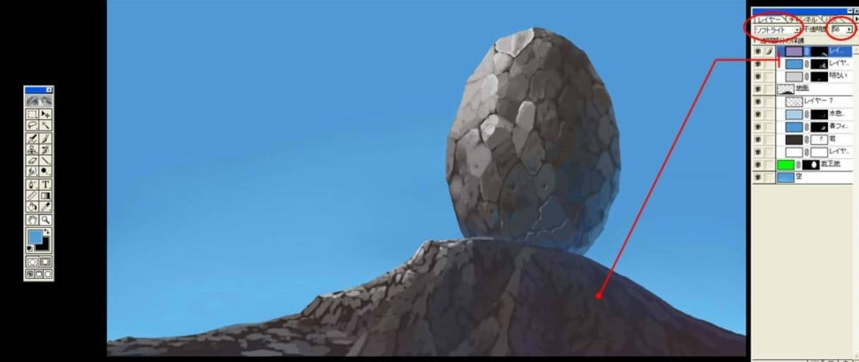 给岩石打上环境光。由于周围是蓝色的,所以蓝色系会比较好吧。(图层模式设定为“柔光”)