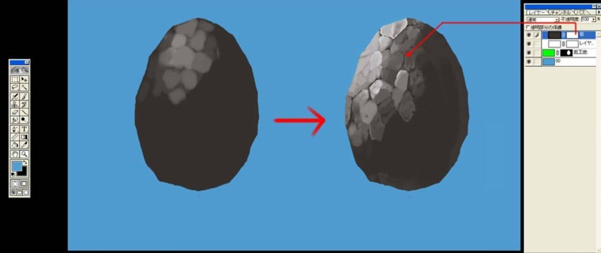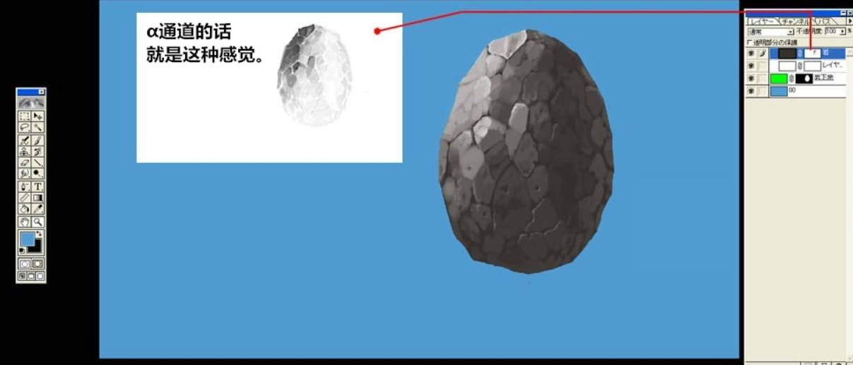 在α通道的作业是黑白的。这里作业的规律是:越是黑色的地方,越是浮现出底色。利用颜色的深浅来表现出立体感吧。