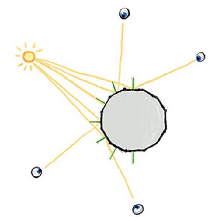 根据眼晴观察者的位置不同,在曲面表面上会看到不同的光线与不同的反光点,如上图。举个例子:虽然说积水潭并不是曲面(由于表面张力除去边缘部分),所以你从某个特定点来观察,你只能看到一个刺眼的反光。反光点只能出现在“点光源”的环境下,例如:太阳、电灯泡或者一扇小窗。