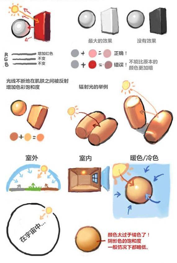 1.7 可读性:你可以分辨出理应被表达的事物。如果一幅画作很杂乱,那么可读性就不高。发射光,环境光,反射光:当光线被一个表面所反射并且射到其他物体上的时候。这个现象总是在发生。举个例子,在一个绿色房间里的所有事物都会获得一个绿色的色相。发射光(Radiosity)是计算机自动创造3D照片的专有名词。在可以追溯倒光源的情况下使用“反射光”,在颜色是从整个大环境中的海个物体中平均产生的情况下使用“环境光”。