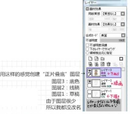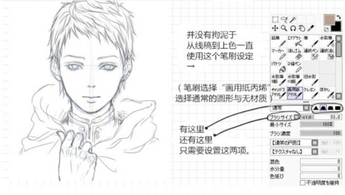 先画出动漫人物的草稿与线稿.。稍后会将线稿图层与涂色图层合并的,大致画一下就OK!并没有拘泥于从线稿到上色一直使用这个笔刷设定。笔刷选择“画用纸丙烯”,选择通常的圆形与无材质。