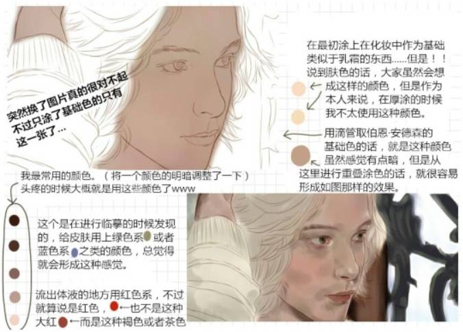 这个是在进行临摹的时候发现的,给皮肤用上绿色系或者蓝色系之类的颜色,总觉得就会形成这种感觉。