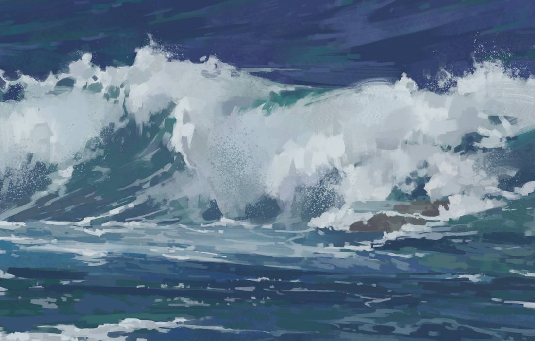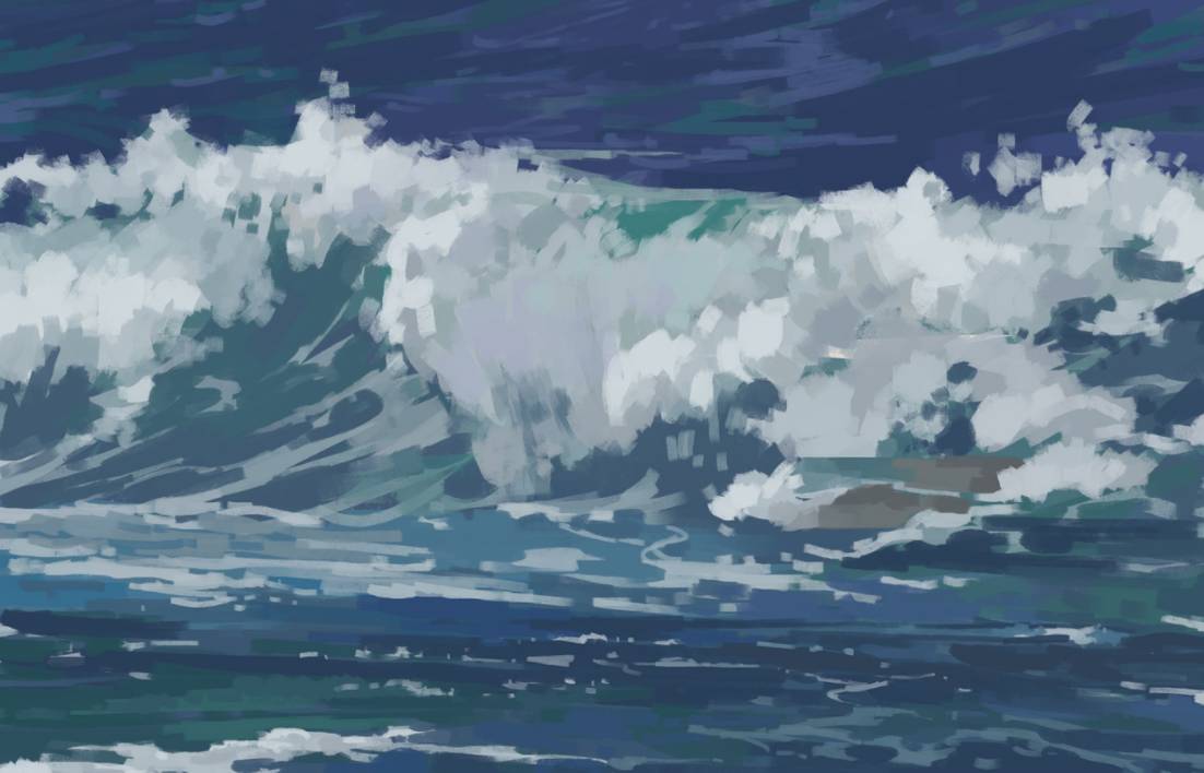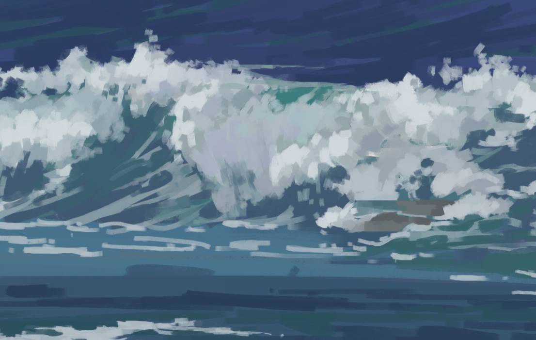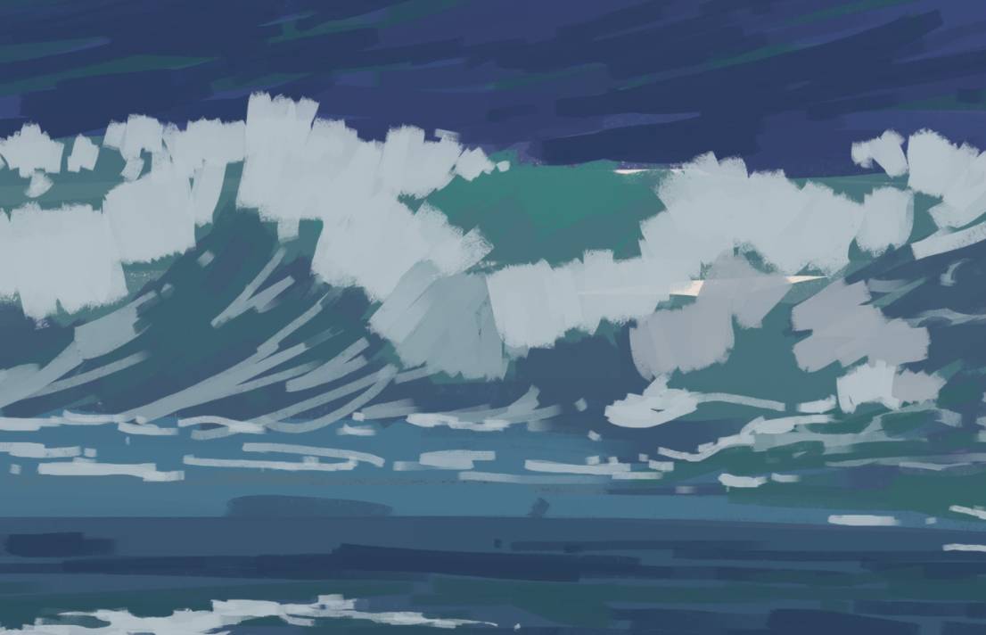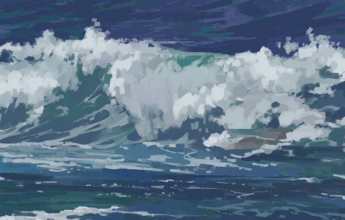 适当绘画加入前景水面细节和浪起伏面的渔网状水花细节,注意疏密/虚实控制。