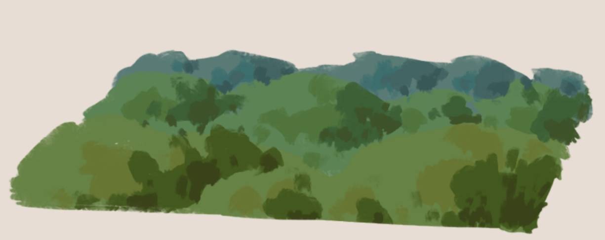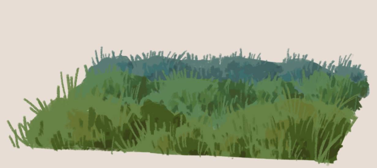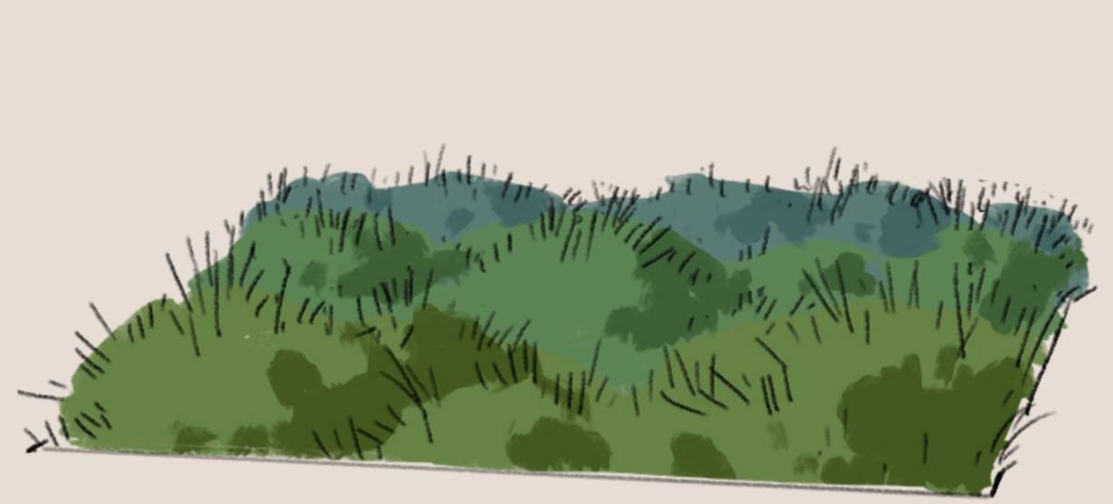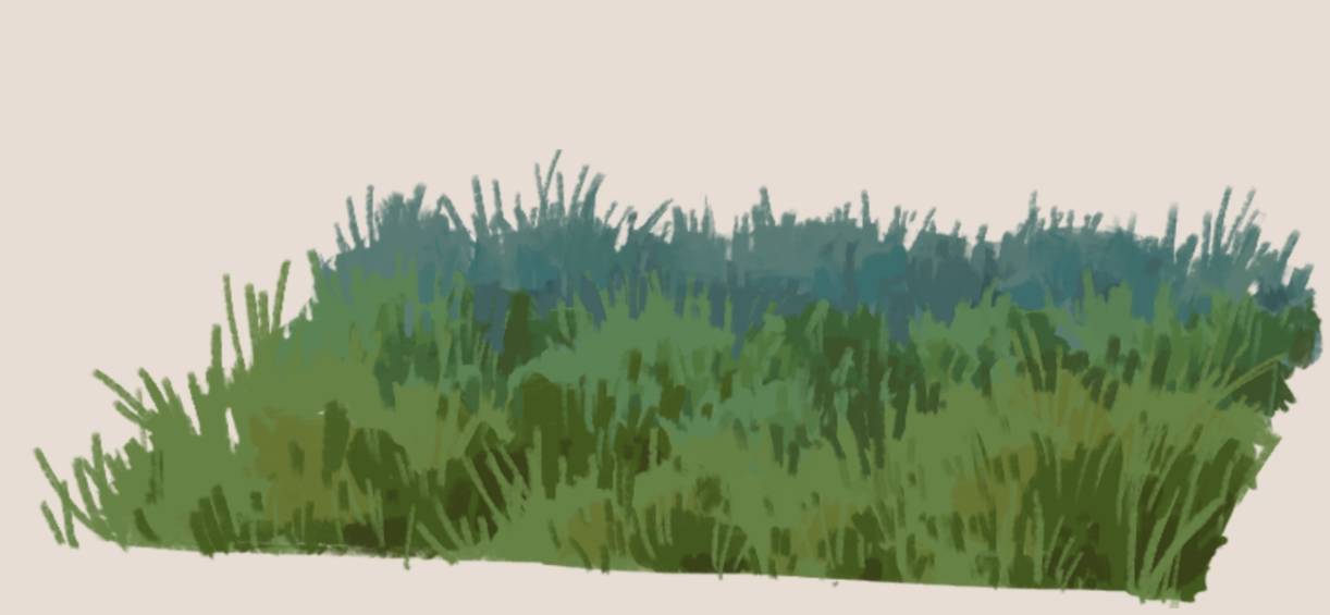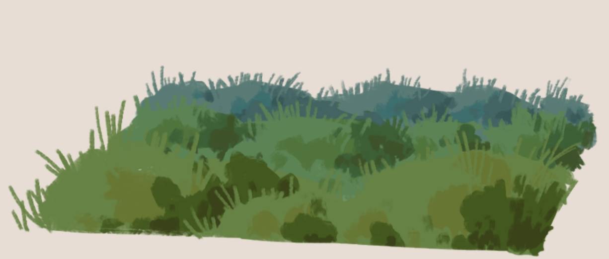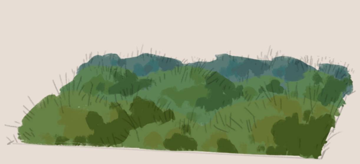 简单画出草的颜色,注意“近处暖,远处逐渐变冷”原则。点出暗部的块面,注意不要过于细碎,大概要看的出球状感。
