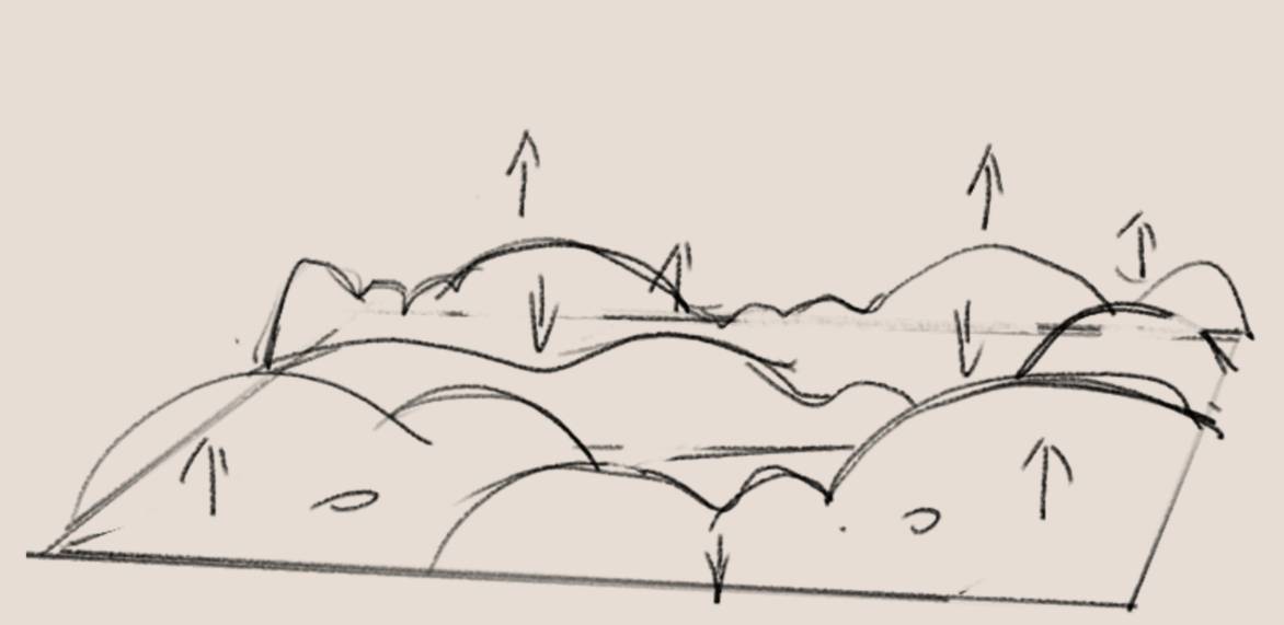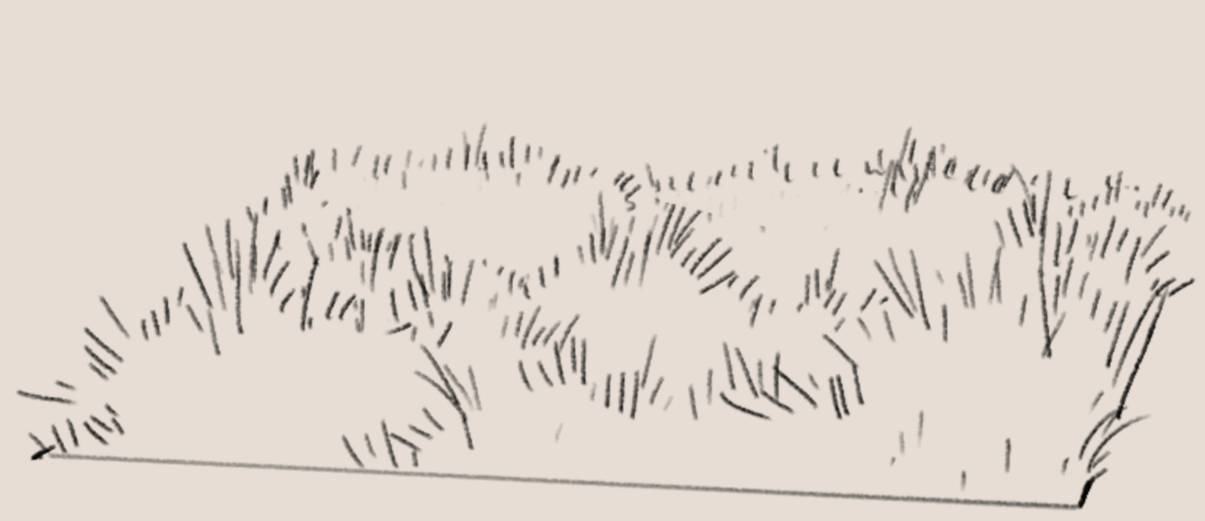 根据基础的起伏,画出草朝向的叶子的大致位置。遵循前长后短,近大远小原则。