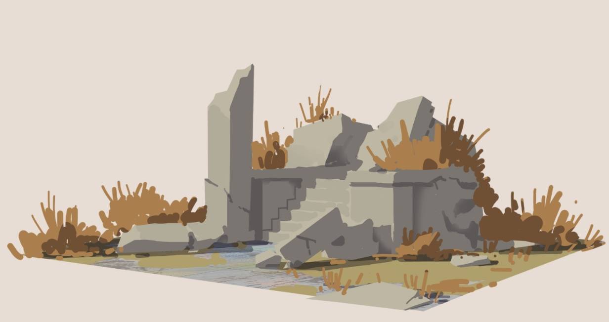 通常我画废墟的时候,我都是先完整画出全部的石头,再去切割出变化来。切割的时候,要注意黄金比的断裂位置,硬线条和软线条的结合。