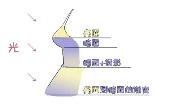 在做二分之前我们来分析一下整个裙子的亮暗面。胸部的隆起,会带来亮暗以及对腹部的投影。光是有衰减的,所以在裙摆处会受到光的影响产生渐变。