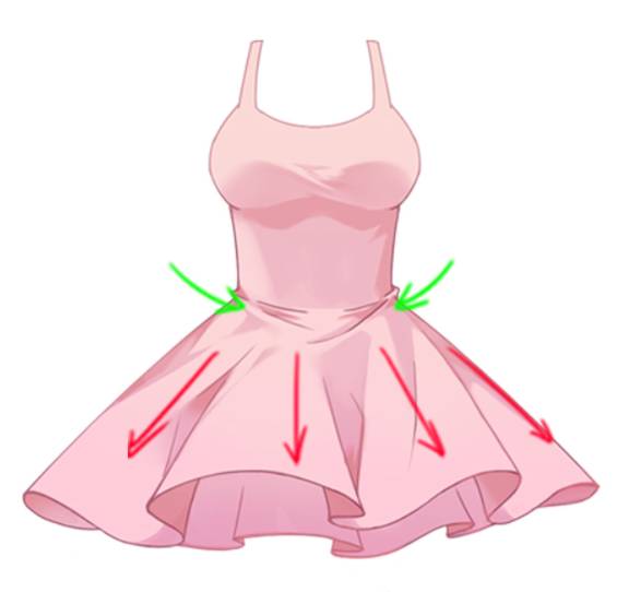 腰部会受力的影响产生横向的褶皱,裙摆会自然下垂产生纵向的褶皱。