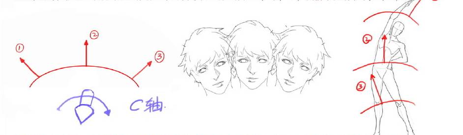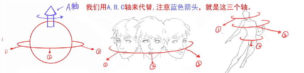 绘画跳舞的人物,我们首先来看一下。如果我们围绕一个轴旋转一个事物的话,那么事实上我们在空间中大概可以围绕三个轴旋转。我们用A、B、C轴来代替,注意蓝色箭头,就是这三个轴。