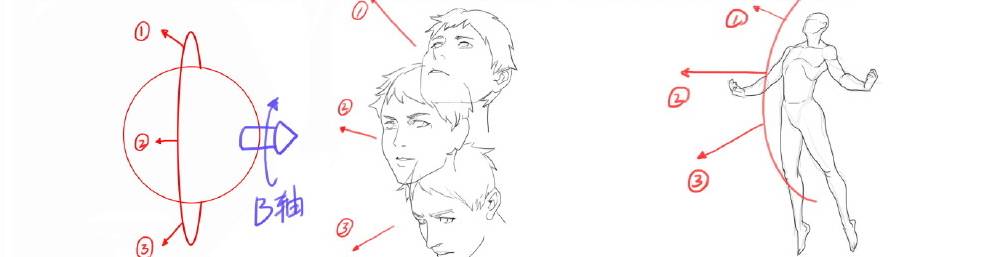 如果围绕着B轴纵向旋转的话大概有三个角度可以呈现大概是上,中,下,我们给他编个号:1、2、3。
