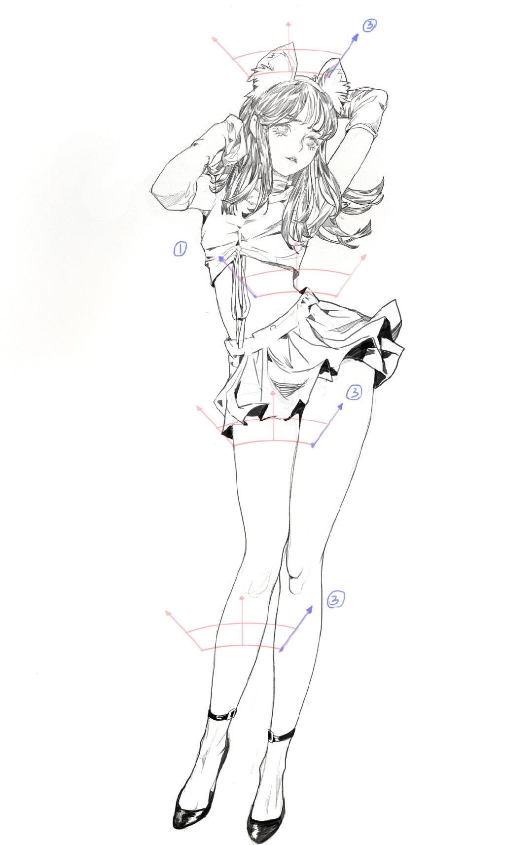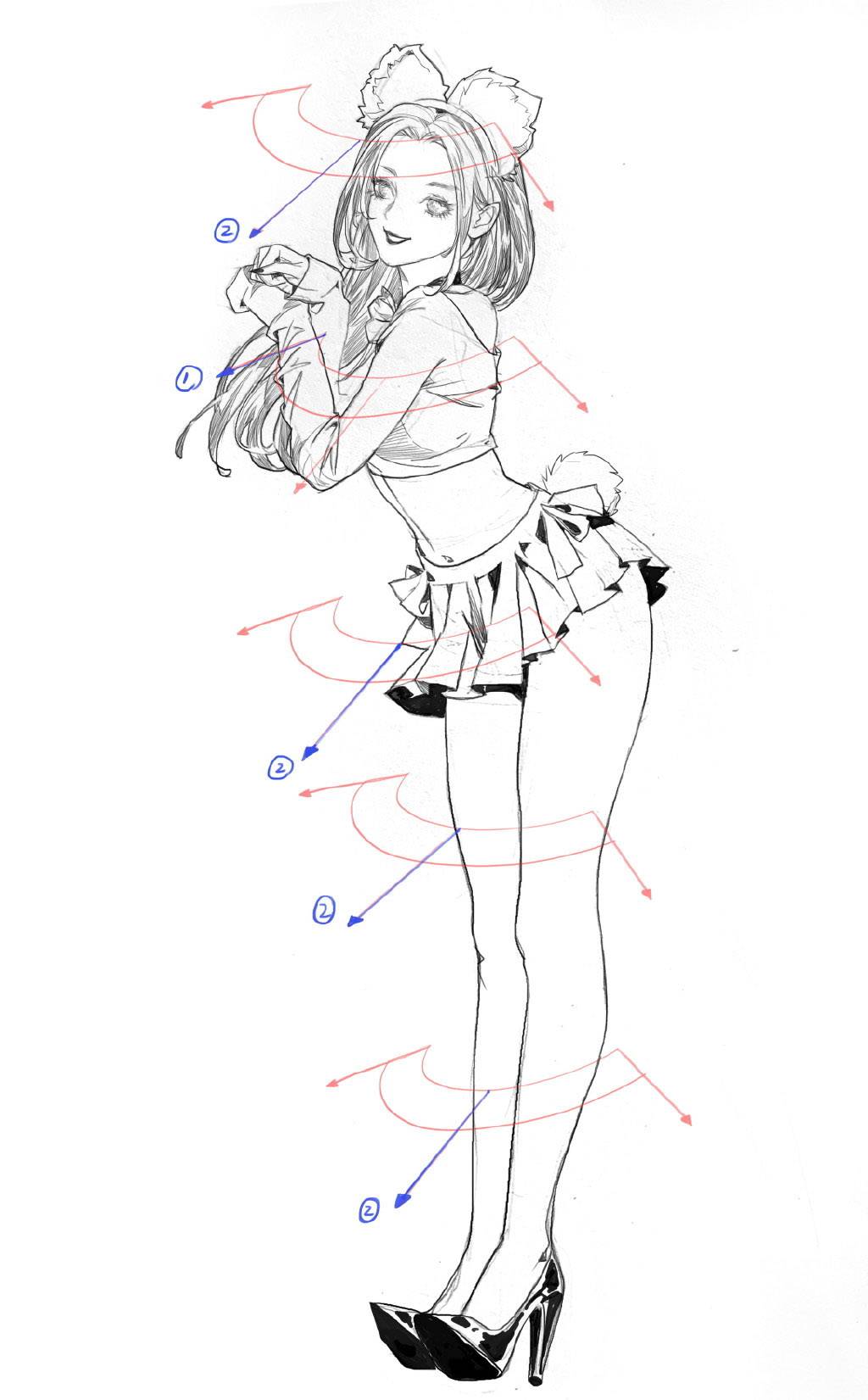 注意B轴上,小姐姐的身体各部分的朝向数字,不同就代表着不呆板。