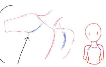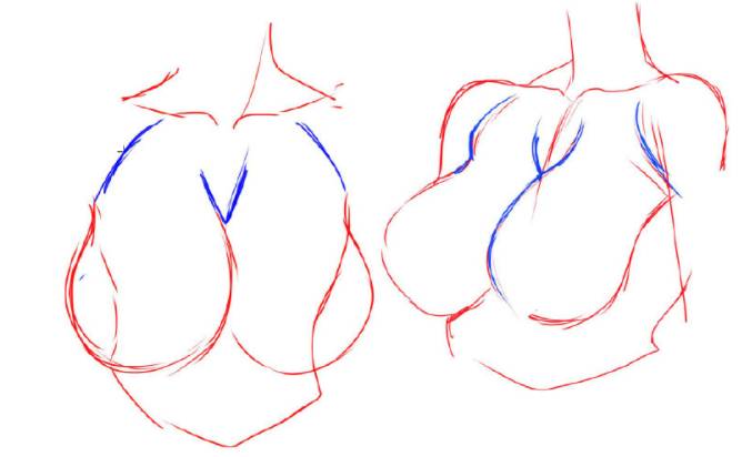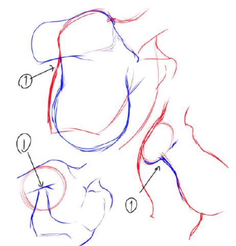 需要注意蓝线部分的形状,思考不同角度下胸部的样子是怎样的。