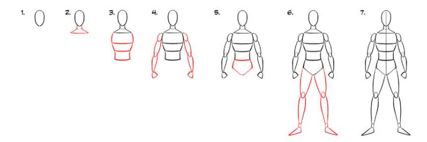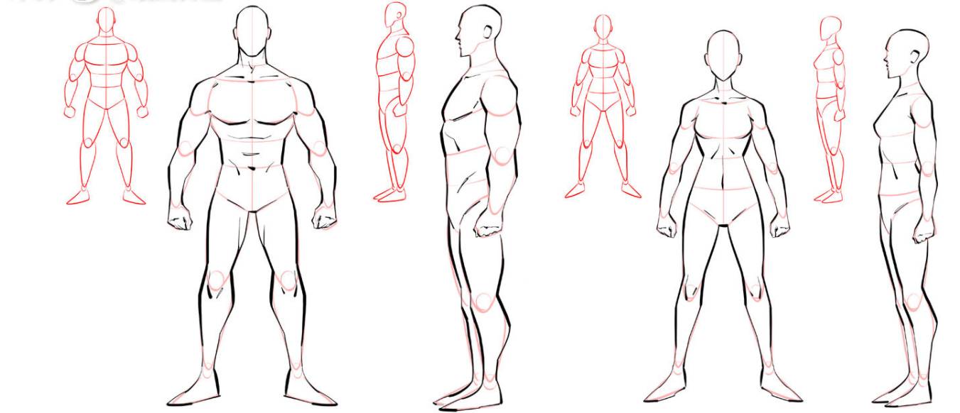 使用这个基本框架辅助绘制人物。其他角度的人物依旧可以用上面的步骤来绘制。通过改变框架各个部位之间的比例,来绘制不同的人体。