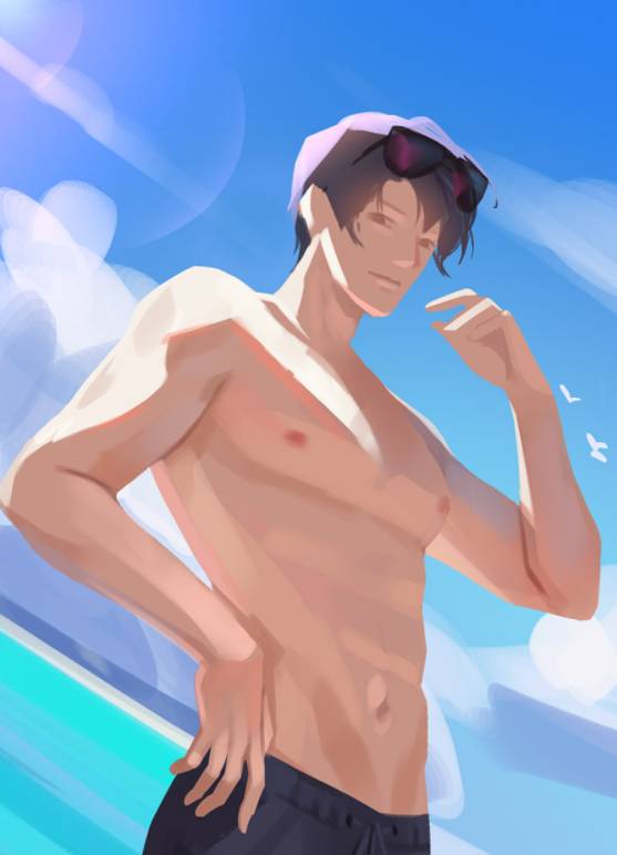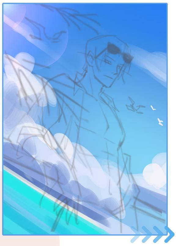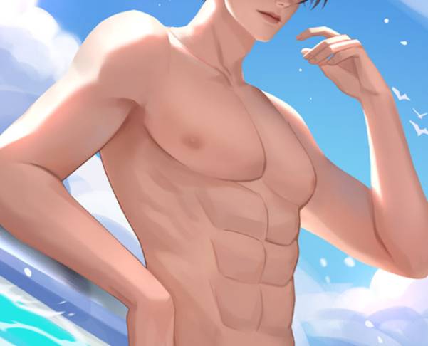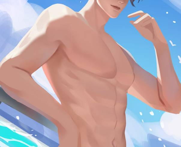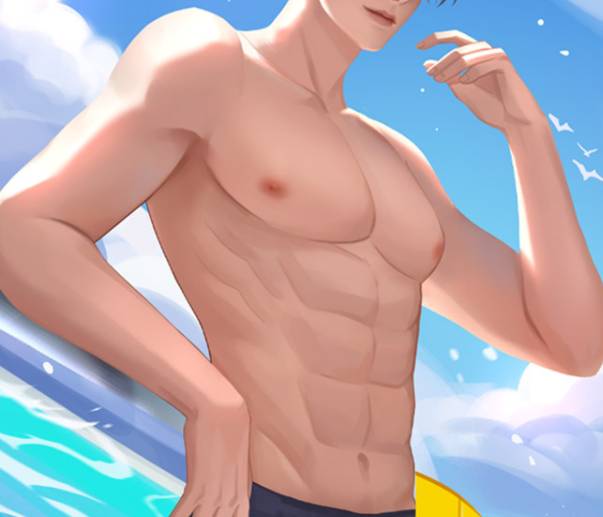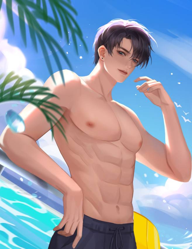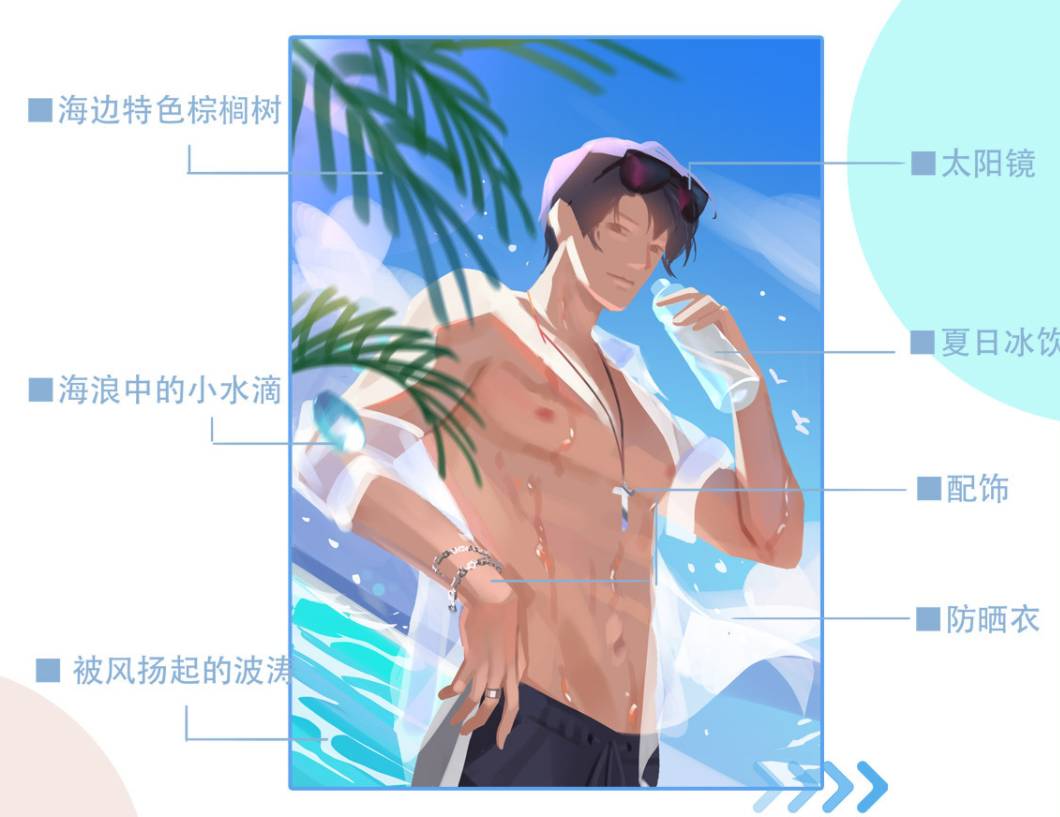 到了这一步还是感觉画面很空荡荡的,缺少了一些东西,那就可以进行第二次的脑洞。联想一下关于目前场景的有关小元素,比如夏天的海边通常会有什么呢?浪花冰饮、冲浪板、棕榈树.…帅哥的身上也可以披一件衣服,佩戴一些首饰!