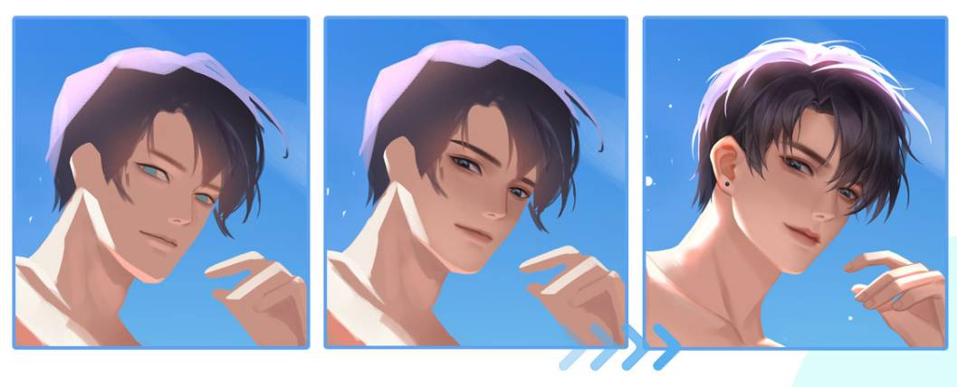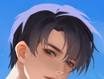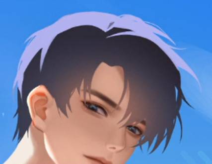 细化去绘画帅哥的头发,处理受光部分的效果,注意受光的明暗交界线会有高饱和的颜色以表达透光的效果,这一笔高饱和也会使得受光看起来更加真实。