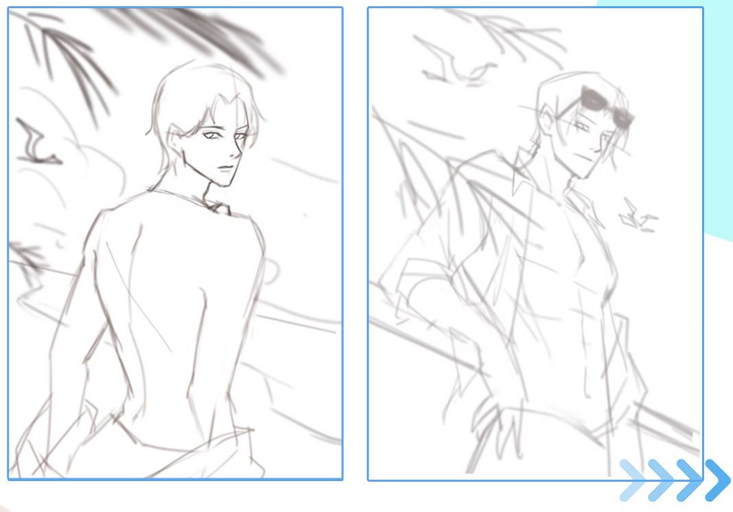 画草稿时,我愿称之为画画最快乐的阶段。在这个阶段里大家不用过于拘束自己,想到什么就画什么,最重要的是把自己脑海中一瞬间的灵感以自己看得懂的方法快速保留下来,结构小崩也不是什么大事,之后都会调整哒~主要目的是快速且爽到!