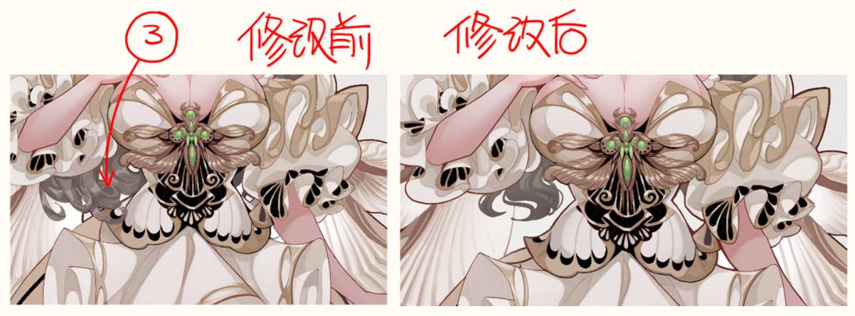 ③腰部和袖子的这部分轮廓也没有很好的拉开层次,有些过密了,节奏不是很好,把发梢剪短,留出空隙,翅膀内部提亮,让腰部和袖子的轮廓更清晰。
