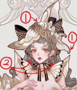 ①首先是帽子的轮廓有点点高,压低一些更贴合头部的轮廓。帽子的小翅膀装饰也可以再张开一些。