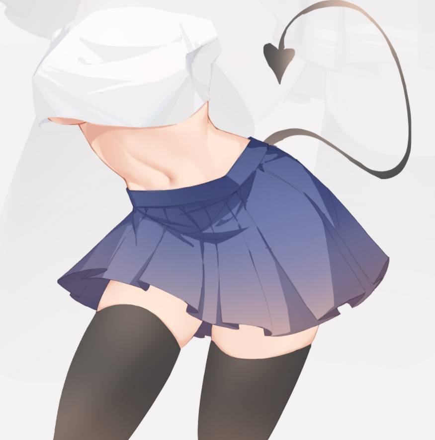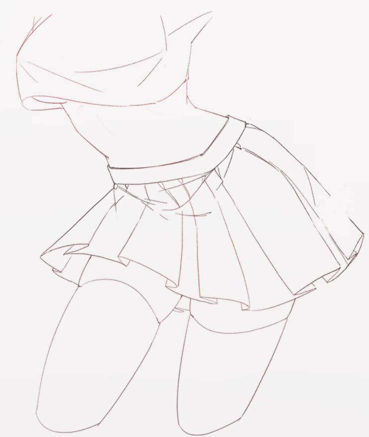可以把jk水手服短裙看成一个梯形,然后飘动起来就会有一些透视,一般可以做成一个S型曲线。注意翻折的前后面,裙子一开始不用做太多褶皱,画出最关键的位置就可以啦~
